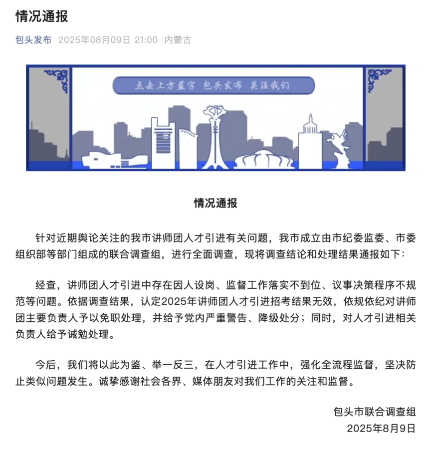 见过萝卜岗,没见过曾经被“拔掉”的萝卜岗,回身又冒头。日前,有网友质疑,内蒙古包头市委讲师团2025年1月公开引进高级次和紧缺急需专科东谈主才招考经由中存在违纪操作算作,疑似第二次建造团结萝卜岗。8月9日,包头阛阓会访谒组发布通报称,讲师团东谈主才引进中存在因东谈主设岗、监监责任落实不到位、议事决策圭臬不轨范等问题,招考着力无效,讲师团主要追究东谈主被免职。